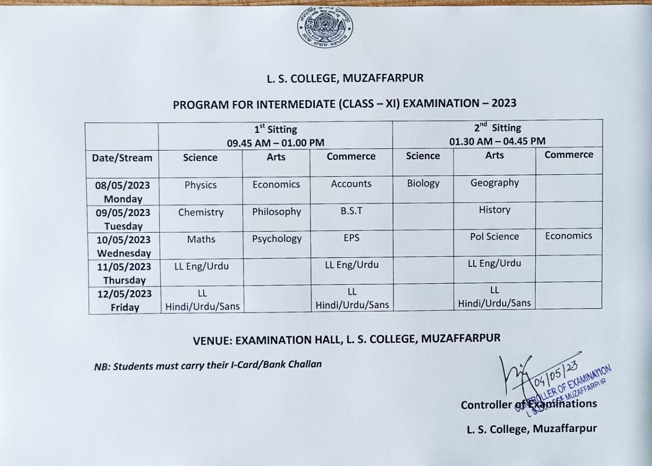 Programme for Intermediate (Class XI) Examination-2023